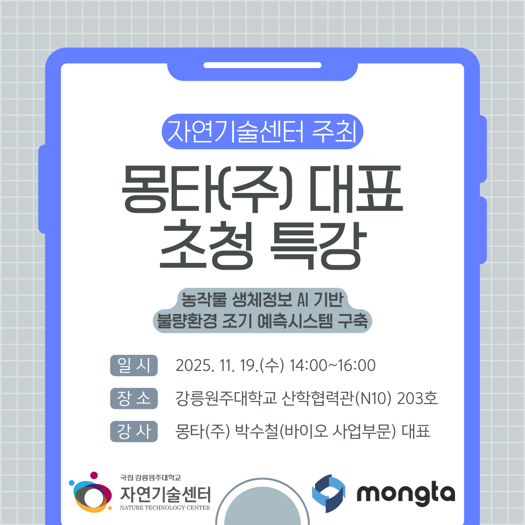 - 행사명 : 행사명: 몽타(주) 대표 초청 특강 「농작물 생체정보 AI 기반 불량환경 조기 예측시스템 구축」