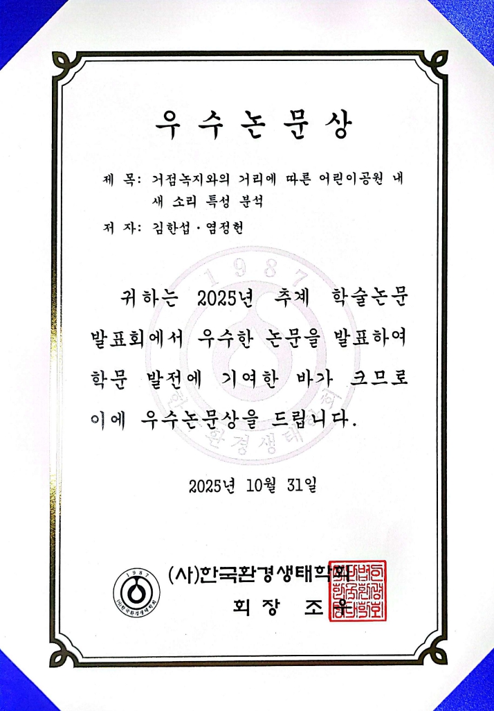 환경조경학과 김한섭 학생 『2025년 (사)한국환경생태학회 추계 학술대회 우수논문상』 수상