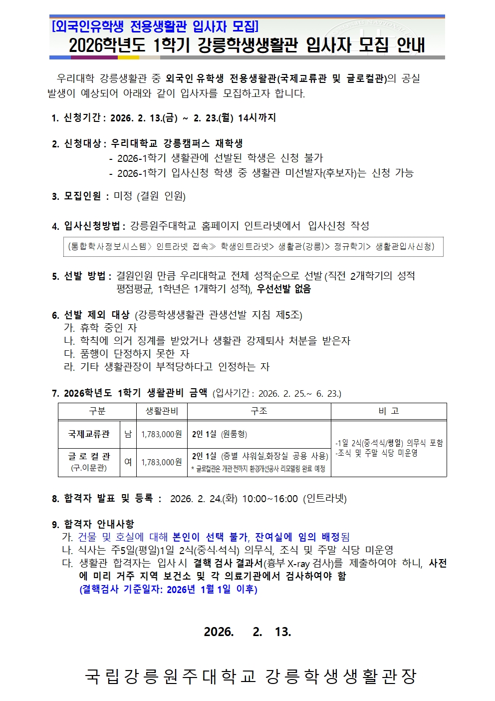 [강릉] [재학생] 2026-1학기 외국인유학생 전용생활관 입사자 모집