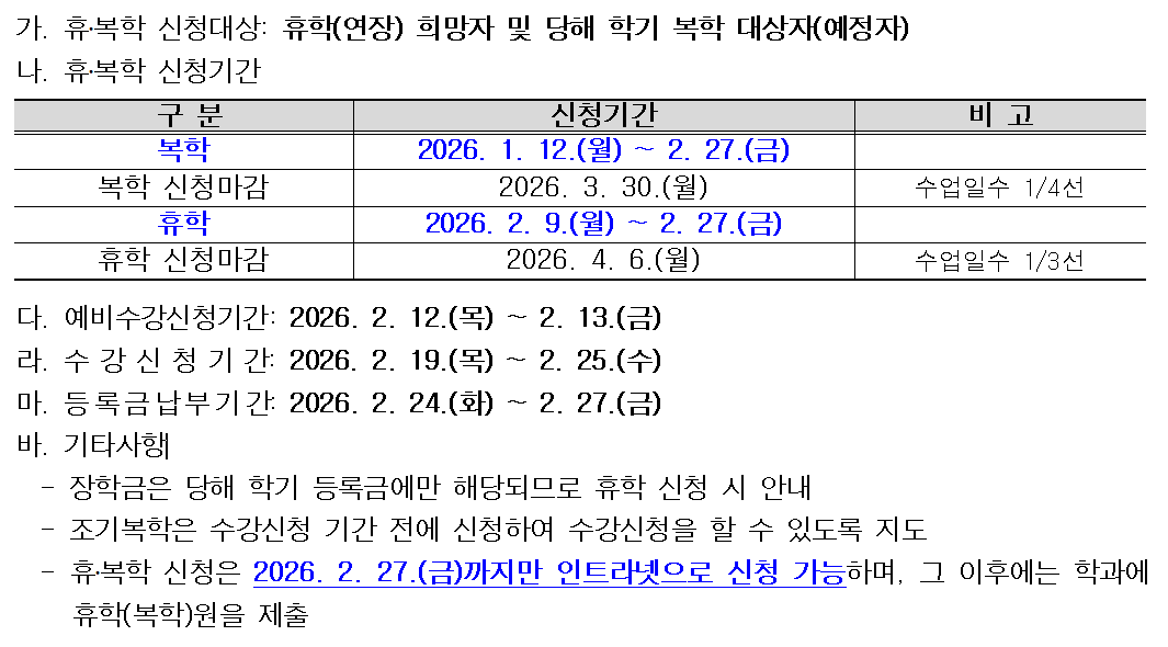 2026학년도 1학기 휴학, 복학 추진 계획