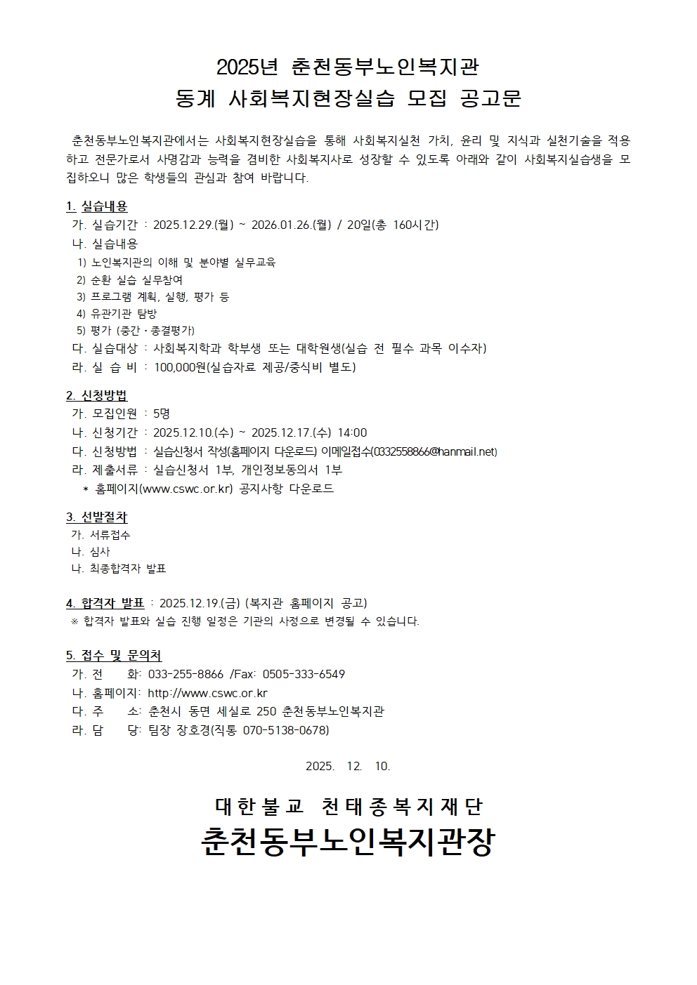 [2026-동계] 춘천동부노인복지관 동계 실습생 모집 안내(~12.17.)