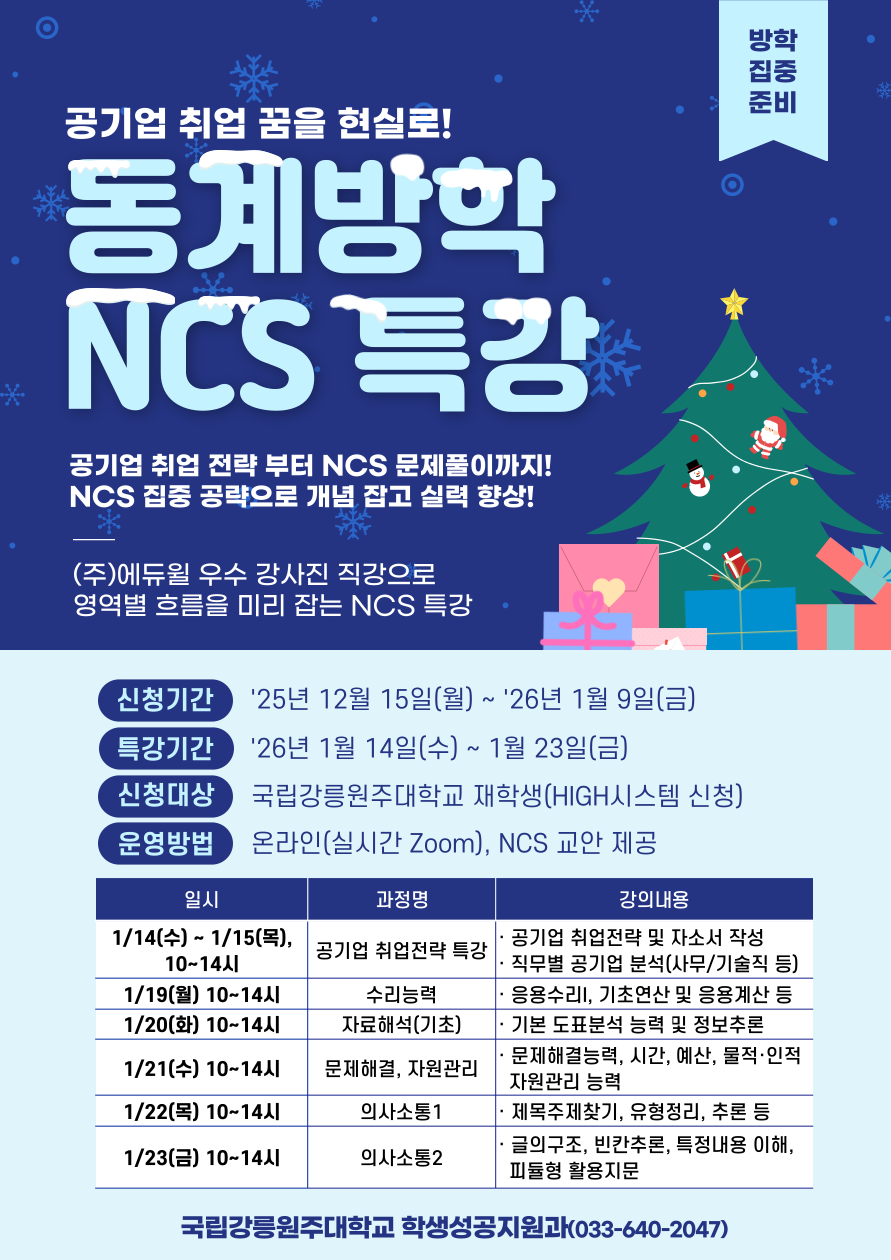 fnctId=bbs,fnctNo=871 [학생성공지원과] 동계방학 공기업 NCS 직업기초능력 향상 프로그램 작성일 2025.12.15 작성자 최지은 조회수 404 첨부파일 첨부파일이(가) 없습니다.
