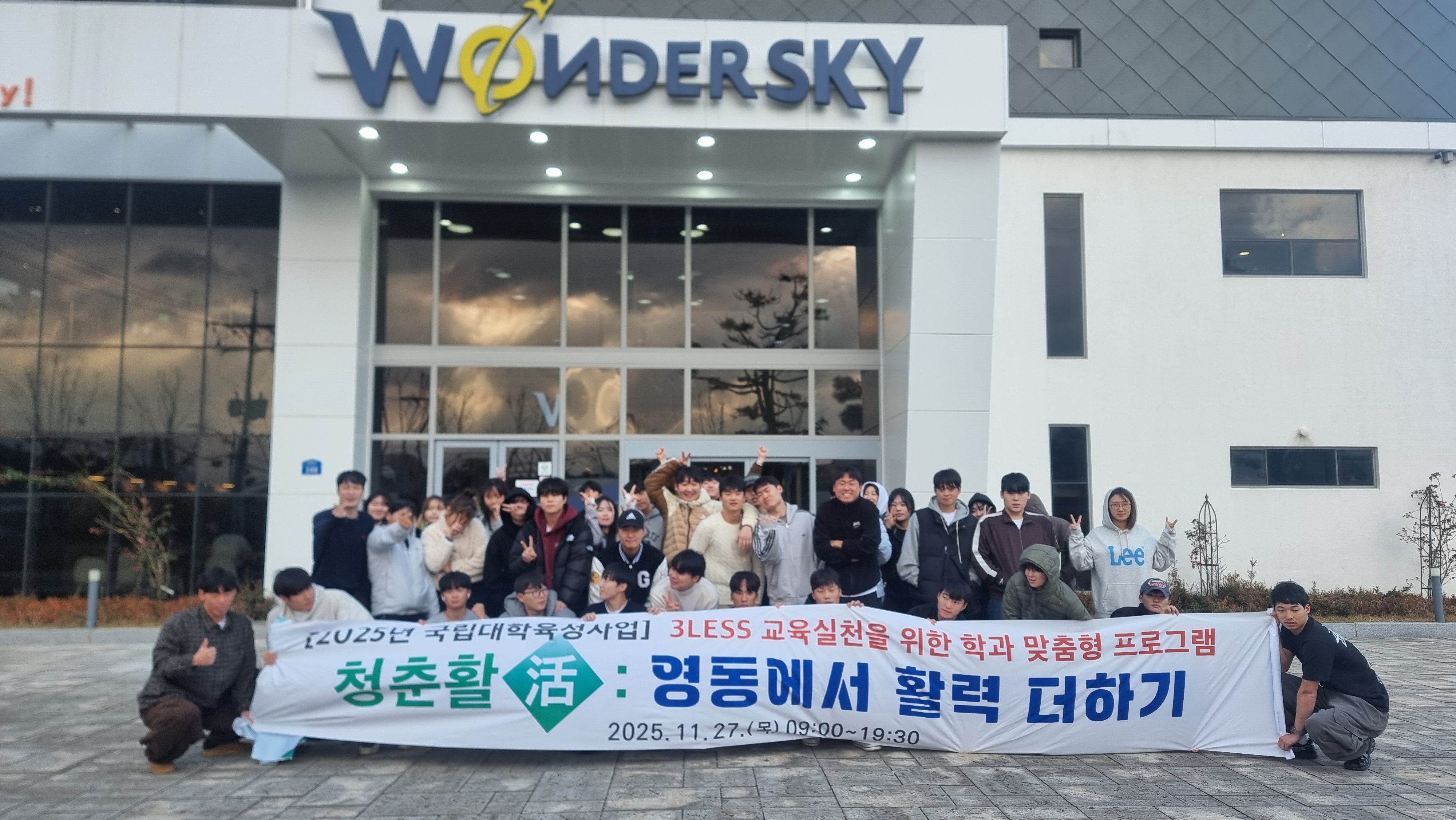 지난 11월 27일(목) 체육학과는 '청춘활活: 영동에서 활력 더하기' 프로그램을 진행했다. 이번 행사는 3LESS(중도탈락·장기결석·학사경고) 교육실천 기반의 학과 맞춤형 프로그램으로, 전공 역량과 지역 연계를 강화해 학생들의 학습 몰입과 공동체 의식을 높이기 위해 마련됐다.